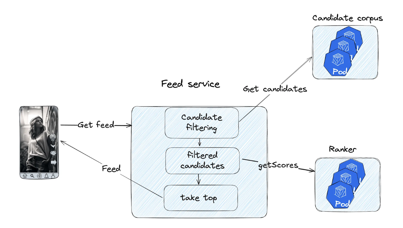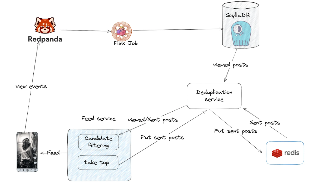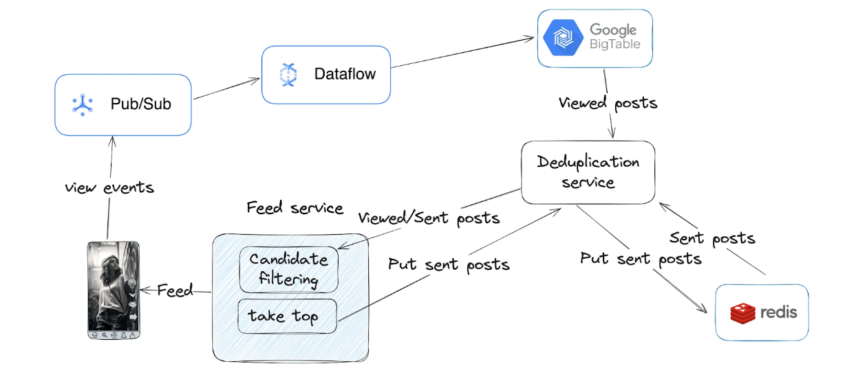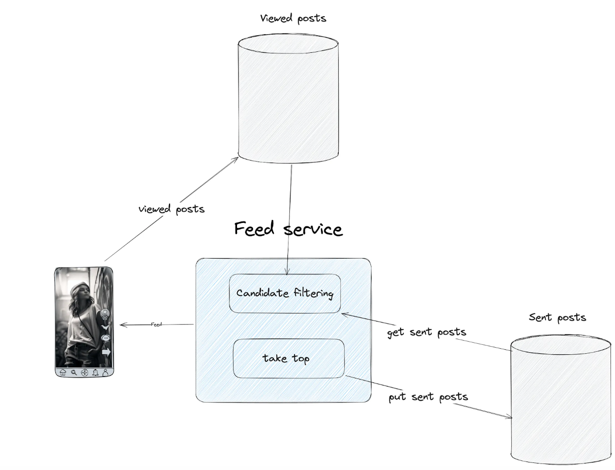 During candidate filtering, Feed Services fetch both sent and viewed posts to exclude them from the response (final feed).