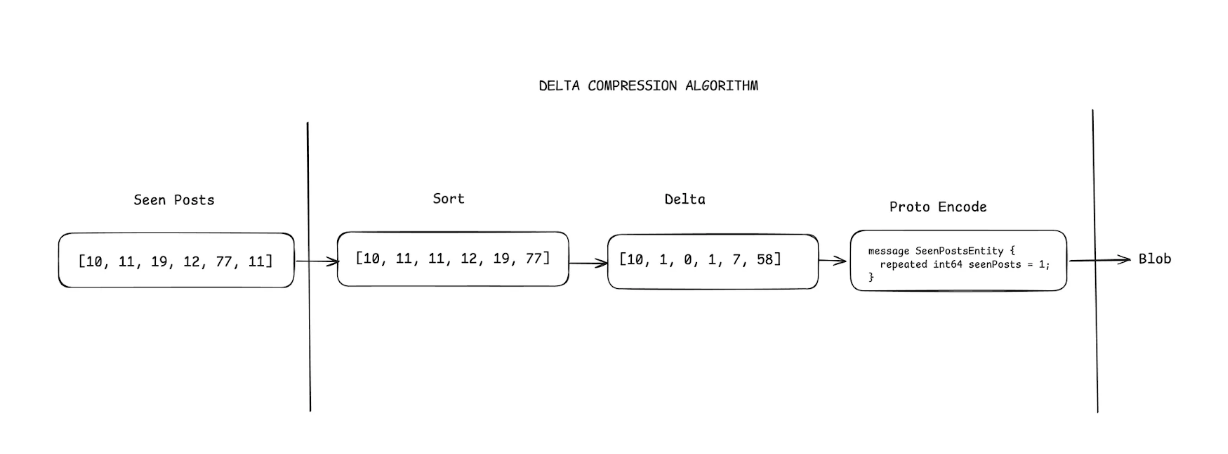 Viewed posts made up the bulk of our ScyllaDB storage, making them the first target for optimisation. The challenge was choosing a compression approach that balanced compute overhead, code complexity, and storage reduction. We experimented with several approaches including bloom filters and roaring bitmaps, before adopting delta based compression.
