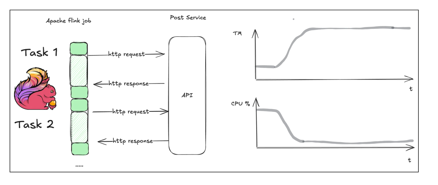 In Apache Flink, we have a fixed level of parallelism, controlled by the number of task slots and TaskManagers. TaskManagers are responsible for executing tasks. Each task runs in parallel, and this model works great for CPU-intensive workloads, where tasks actively use the CPU to process data. But when each task makes external HTTP requests, we began to see obvious problems: most tasks were stuck on network I/O. The number of TaskManagers increased to handle the parallelism because Flink thought we needed more resources. However, CPU usage per TaskManager actually dropped because tasks were mostly idle, waiting for API responses.