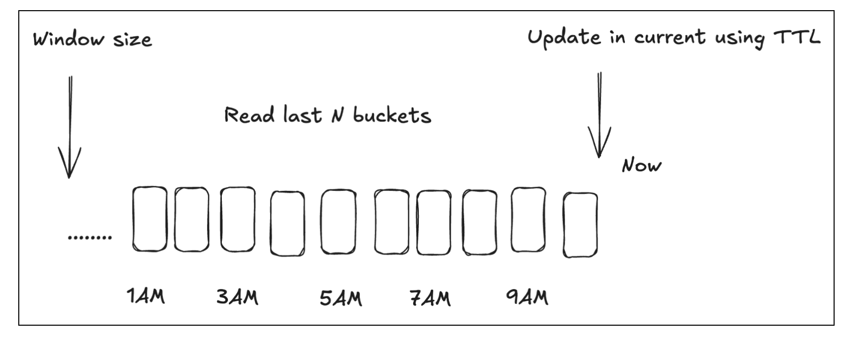 When a new event arrives, we check the recent history by reading the last N buckets. If we have not seen it yet, it is added to the current hour’s bucket.