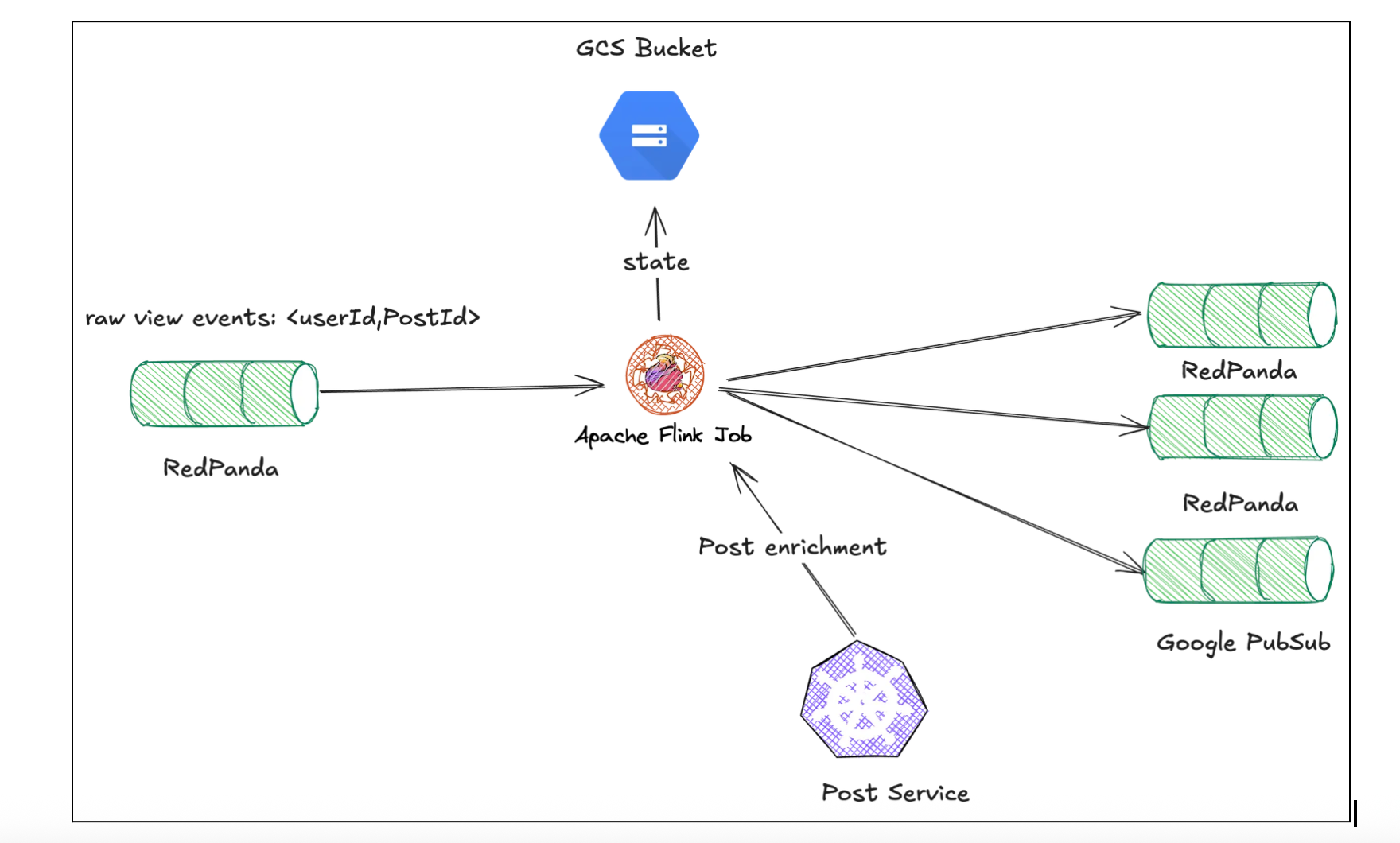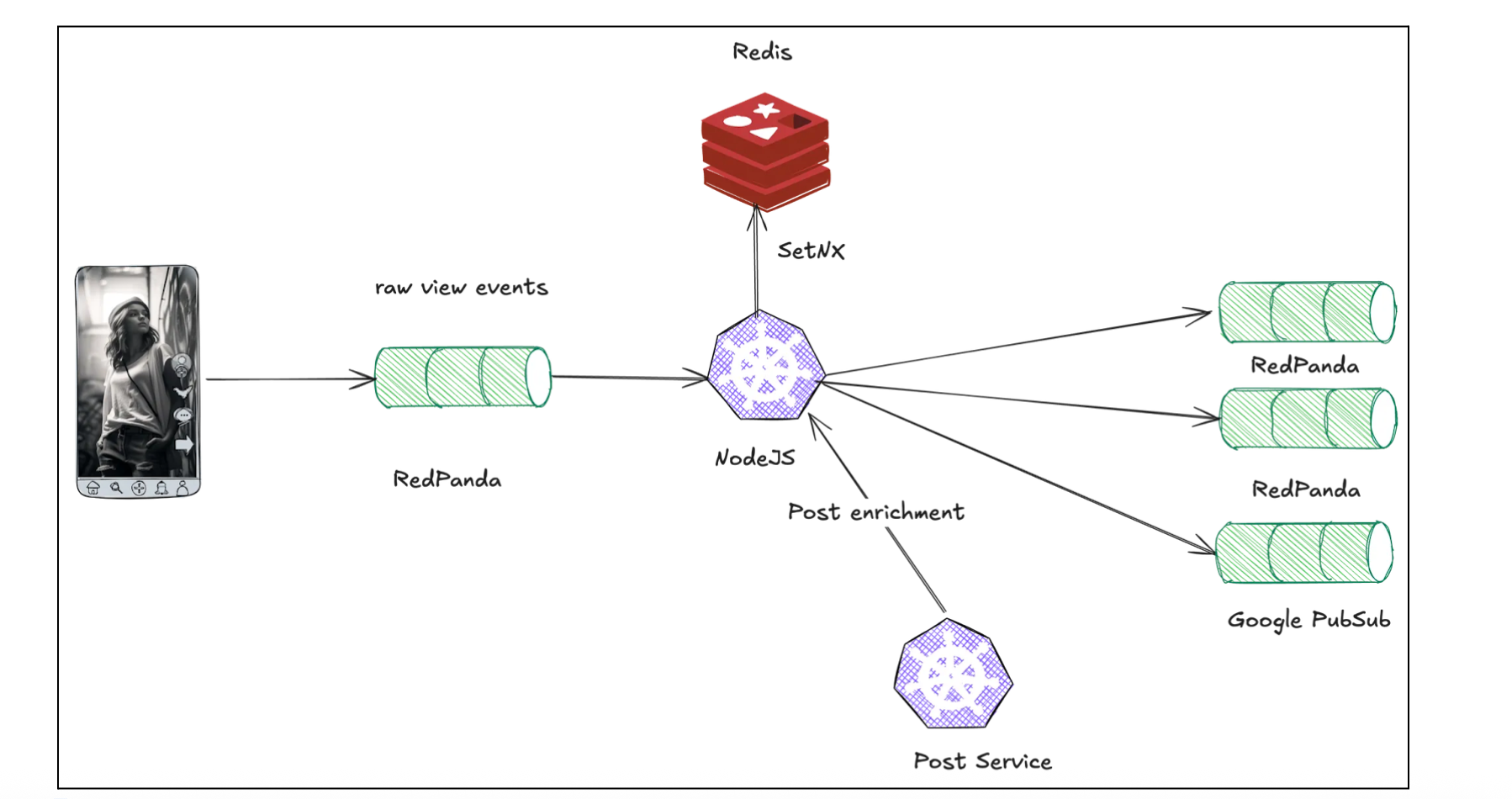 This processing logic was implemented in a Node.js job. It consumed events from a RedPanda topic, used Redis to store the (userId, postId) keys with TTL equal to window size via the SETNX operation (SET if Not eXists), and enriched unique events by calling an external post service for additional metadata (e.g., post language). Finally, it published the transformed events to downstream queues.