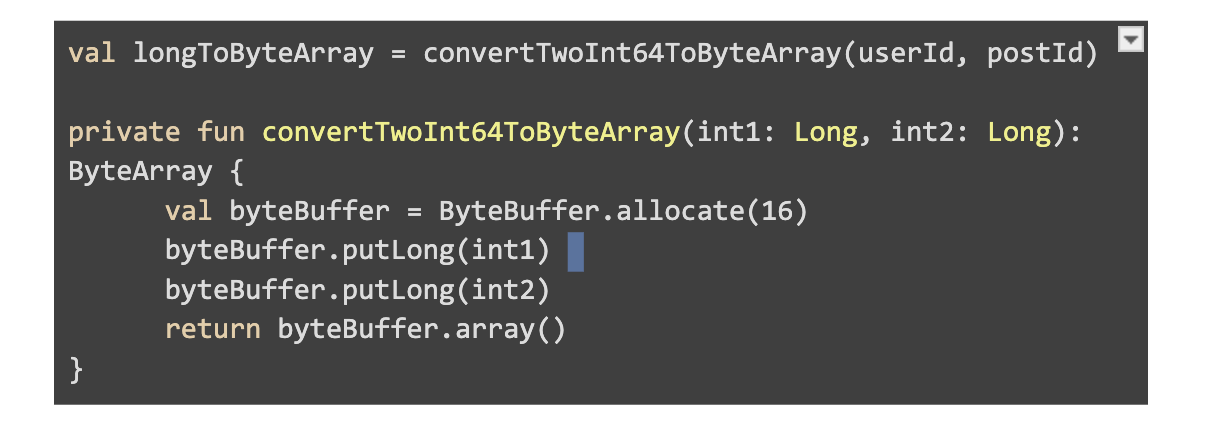 - Key → (userId + “_” + postId) serialized to ByteArray , Value → Boolean