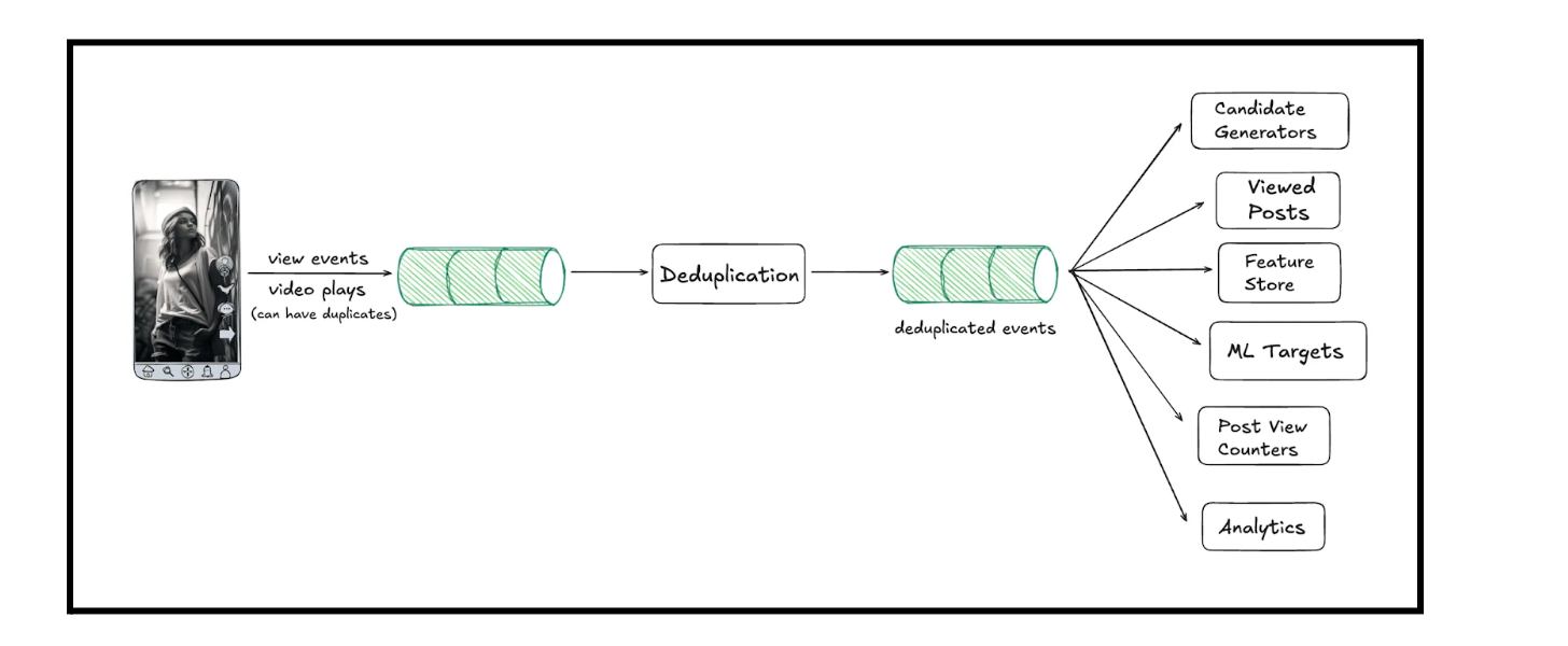Every time a user views a post, an event is fired to inform us. We feed this real‑time stream into our recommendation system, e.g. analytics pipelines, feature computations, and view counters. With more than 180M monthly active users, we ingest over three billion events per day and see peaks above 100k events per second. Unfortunately, client-side events are inherently noisy - duplicated events can arise as users scroll or navigate the app. Any duplicates in the raw stream introduce noise that degrades recommendation quality and wastes compute.