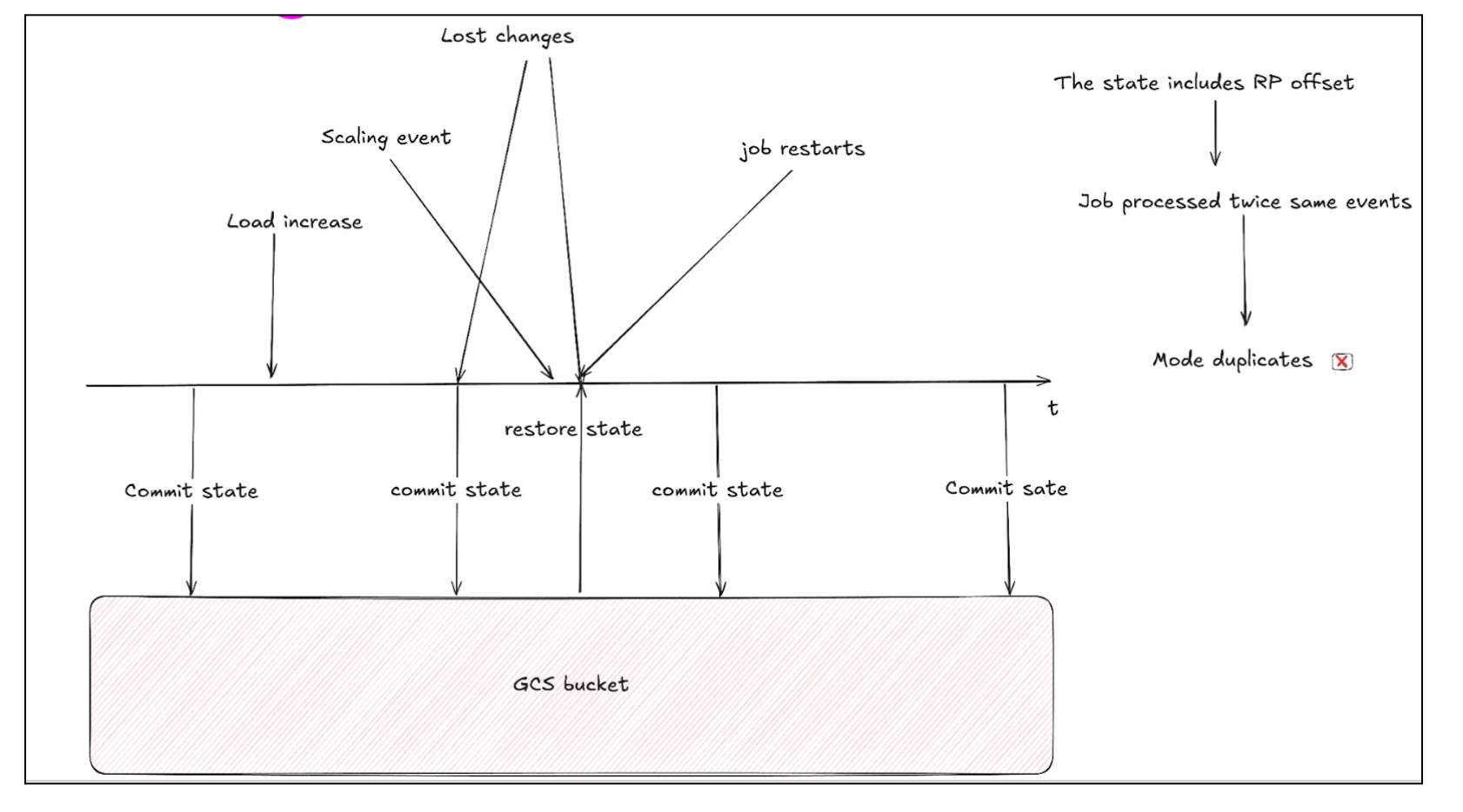- That checkpoint includes the Redpanda offset, which might be outdated because newer data was already processed after the checkpoint was taken. So, when the job restarts, it replays the same events again.