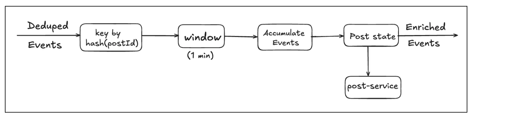 Our initial approach was a sliding window deduplication of events. For each event, we would check for the existence of a (userId, postId) pair within the window. If the pair already existed, we dropped the event.