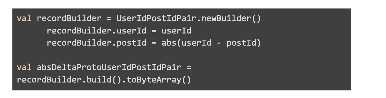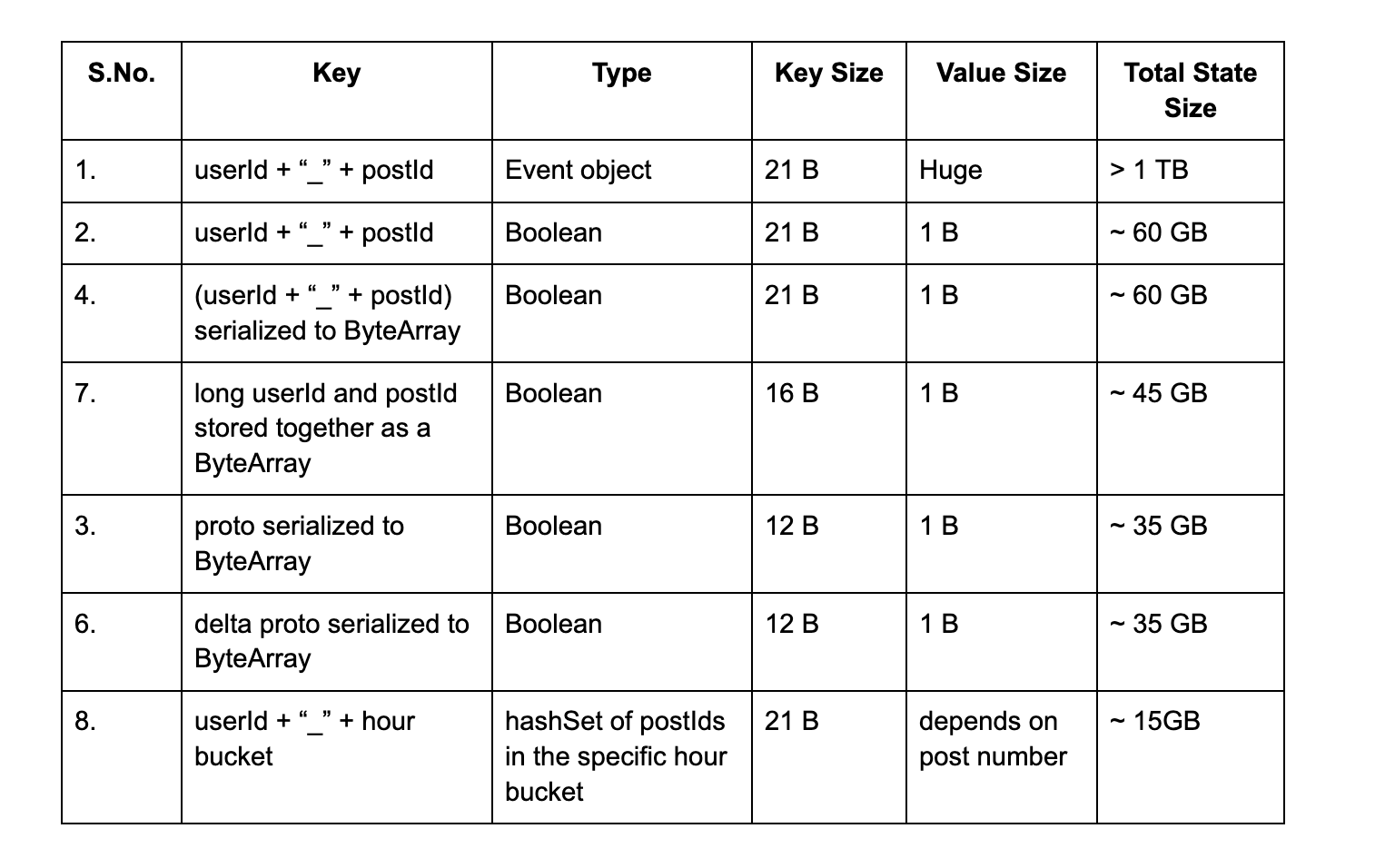 - Key → proto with delta based compression (having postId stored as the absolute difference of userId and postId) serialized to ByteArray, Value → Boolean💡More details on Delta Based Compression can be found here.