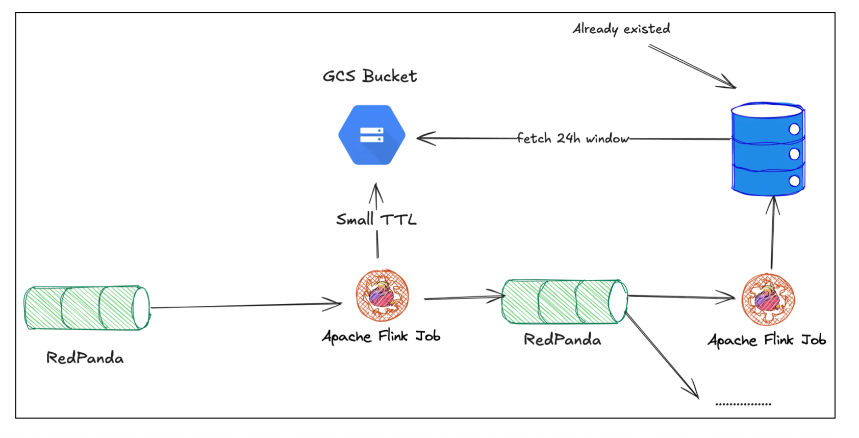 The solution to this problem was to use external storage for the last 24 hours of post data. At this point, we realized that we already had the user view history and could reuse it. We wrote more details about this in a previous post. Querying the external database for each input event would generate too much throughput on it, thereby increasing the database cost. However, we could query it only if the Flink state didn’t have the view history for a specific user. Therefore, we decided to use Flink state with a 2-hour Time-to-Live (TTL) to store all unique events encountered in the last 24 hours. This state would be populated from the external database when processing an event for which the state was empty for that user. Since the state is not empty most of the time, the additional load on the external database was tiny. In a way, the Flink state would serve as a cache, while the external database would be the source of truth.