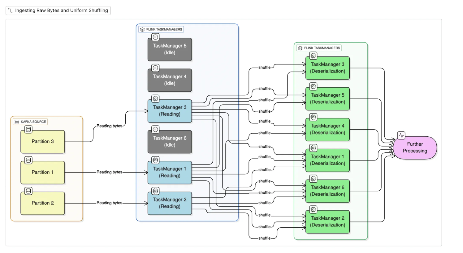 This restructuring has had a significant impact on resource efficiency. By offloading deserialization from the source and evenly shuffling records across Task Managers, we ensure that all available compute resources are utilized effectively.
