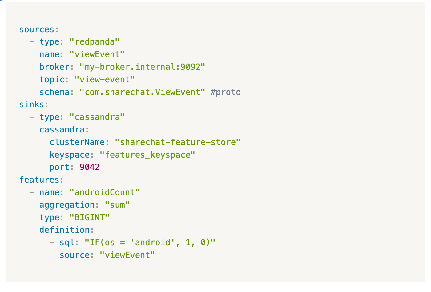 Using SQL queries on these source tables, we performed business-specific filtering, transformation, and enrichment to derive raw features. This included operations like timestamp normalization, field extraction, conditional logic, and joins all expressed declaratively in SQL. The key benefits are also that SQL offers a number of built-in functions (link docs), is well known as a language and allows software engineers as well as product managers to write and review feature definitions.