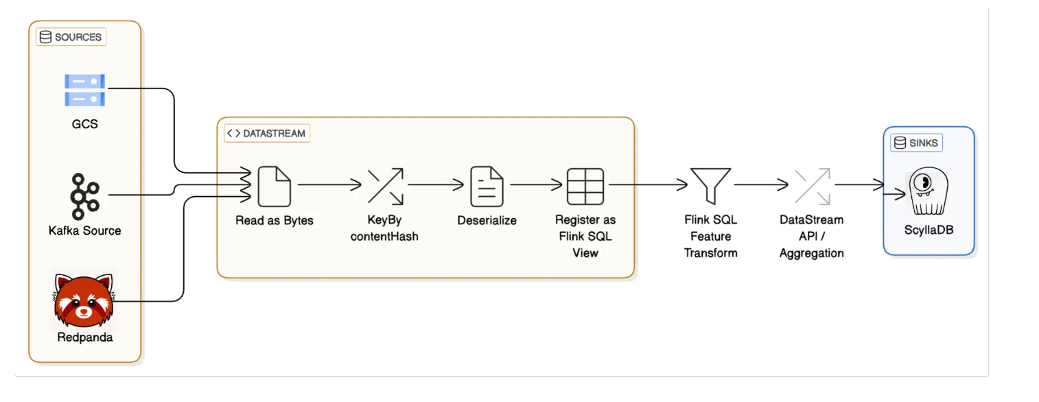 It's highly configurable via YAML, letting teams define data sources (Kafka, Redpanda, WarpStream, or GCS), feature logic, and sinks (primarily ScyllaDB). A feature serving layer on top of ScyllaDB enables low-latency inference at scale.