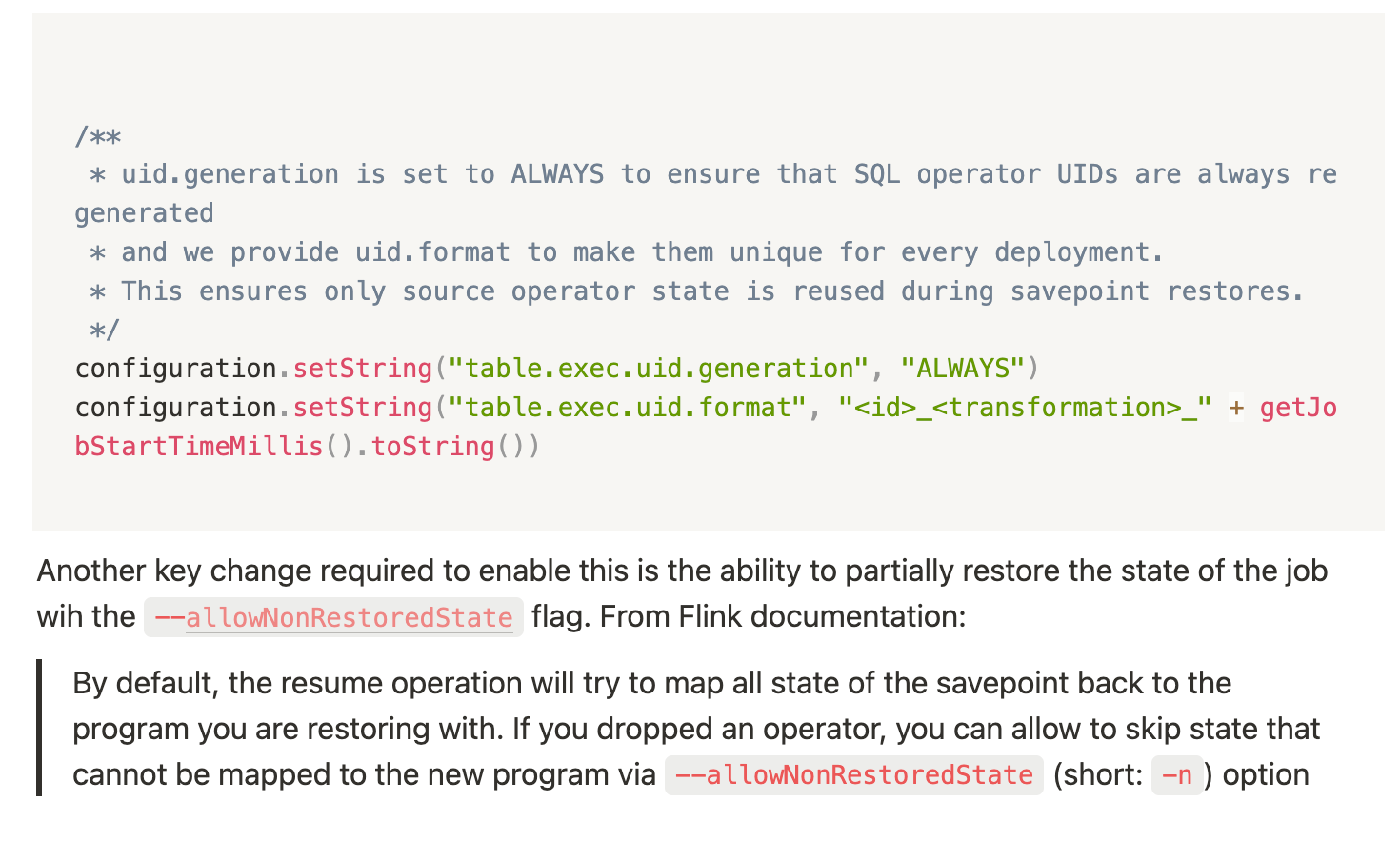 2- Source operator State Recovery Flink SQL abstracts away the underlying source operator, which restricted our control over state recovery. Even with savepoints, when the SQL code changed we couldn’t recover source operator state since Flink SQL controls it and would generates new operator IDs based on the query plan. In our case, loss of state became especially problematic for the following types of sources, leading to issues not just in performance, but in correctness as well: