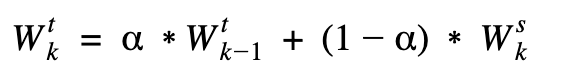 After the weights of the student are updated for a fixed number of iterations using back-propagation, the weights of the teacher model are updated as the exponential moving average of the weights of the student model. The weight update rule for the teacher model at iteration k is given in Equation. 2, where Wˢ and Wᵗ are the weights of the student and teacher model respectively and α is the parameter for moving average.