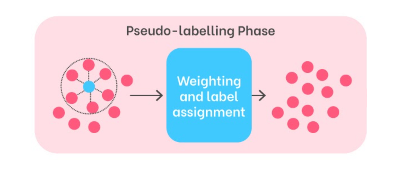 In the transductive SSL setup, labels are predicted for the unlabeled examples based on their similarity with the labeled examples. More concretely, a graph is created with nodes being the data points and the edges representing the similarity between these data points. This graph is then used to predict pseudo-labels for unlabelled data points based on its labeled neighbors and their connectivity with the given data point. After assigning pseudo-labels the model can also be trained on the combined set of labeled and unlabeled data points in a supervised fashion.
