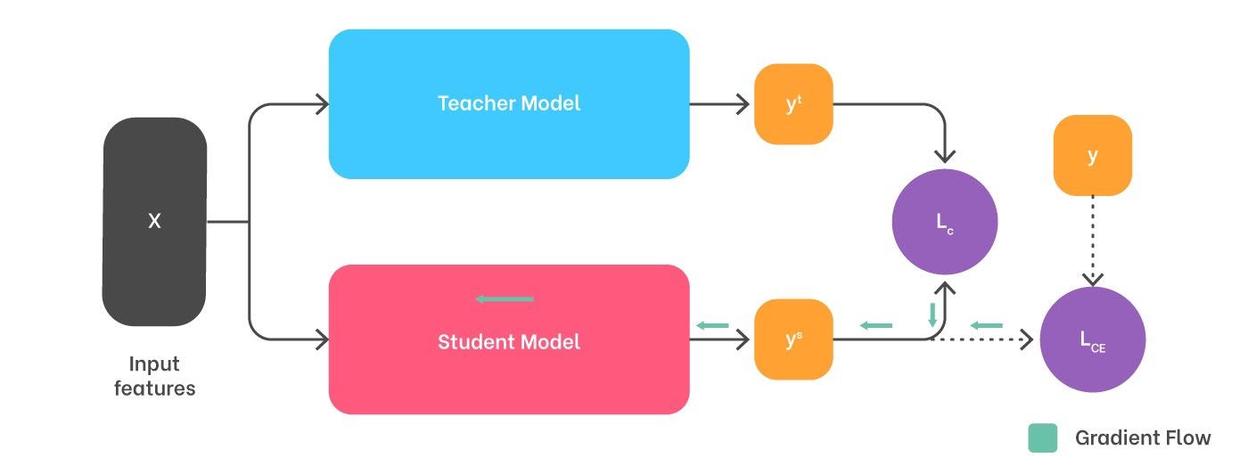 It is important to note that the loss applies only to the Student Model. Thus the gradients and weight updates are only produced for the Student model.