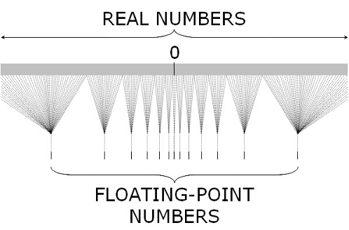 With discrete integer representation, using n bits, we can at most represent 2^n distinct numbers. However, using floating point representations enables us to represent a much wider range of numerals in the number line. This happens due to the non-uniform nature of the exponent component that distributes the range of 2^n distinct numbers non-uniformly to have a much dense distribution towards the center of the number line (near zero value) and a sparse distribution towards the extremes due to its exponential nature, as described in the following figure: