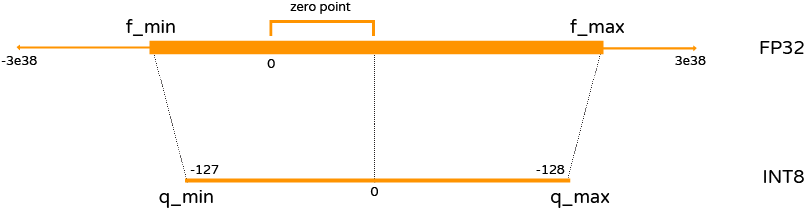 Let us assume that the distribution range of the input data is known apriori, and take an example of conversion from a floating point set (FP32) to Integer (INT8) discussing the conversion process.