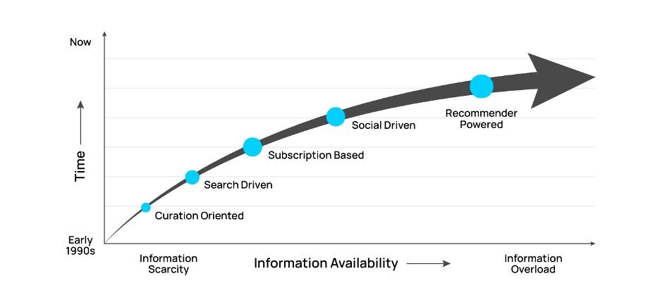 Platforms that truly stand out and win the love of their users are the ones that give (the best possible user experience) before they ask (anything from the user). They do so by building the right levels of user empathy, technological savviness, and intelligence (both the artificial & natural kind). The Moj & ShareChat home page is a prime example of this. In order to achieve this, understanding our users and their emergent behaviors plays an important role. The following illustration provides more context around how user preferences towards information consumption have evolved over time.