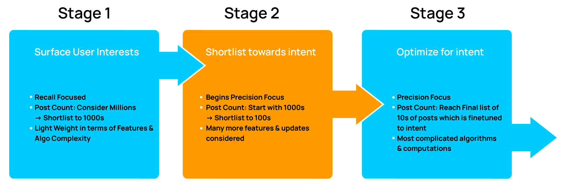 How it Comes Together — Multi-Stage Ranking System — If we frame this problem as finding the affinity of a user with each post (not just the posts from the creators or the genre the user is following), the multi-stage ranking system has the ability to smartly condense this problem and enable us to balance between multiple conflicting but important objectives such as precision, recall, systematic explorations across multiple content types, trending content and exploit known preferences. It also ensures that new posts and young creators are able to fairly compete in the system by ensuring that there is no ‘system’ bias in the lifecycle of a user or a post (will be covered in detail in future blogs).