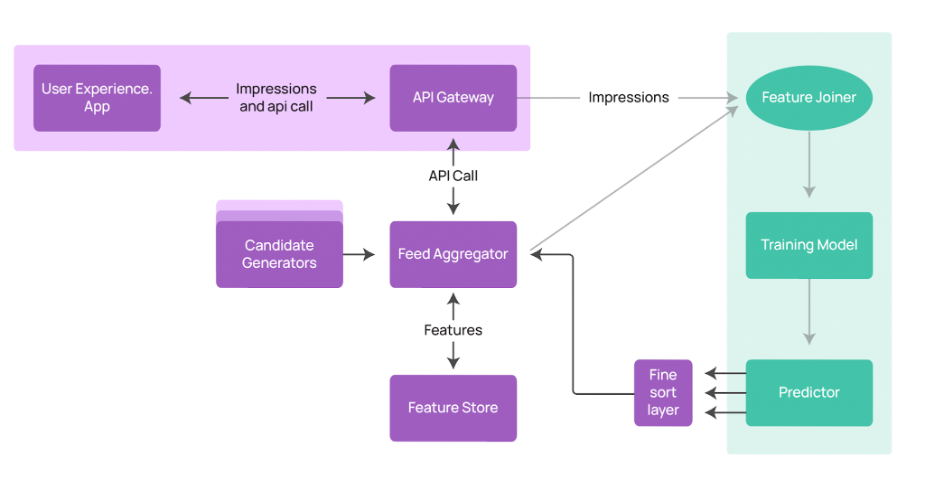 As soon as the app is opened, a request is sent to the backend system from the client, where the feed aggregator collects posts from different candidate generators. After getting the set of potential posts, features are fetched from the feature-store which is then passed to the predictor. The predictor processes the post and ranks them based on different user, post signals and multiple contextual features. All the features are also logged which are then joined with impressions to create a feedback loop for our ranking model.