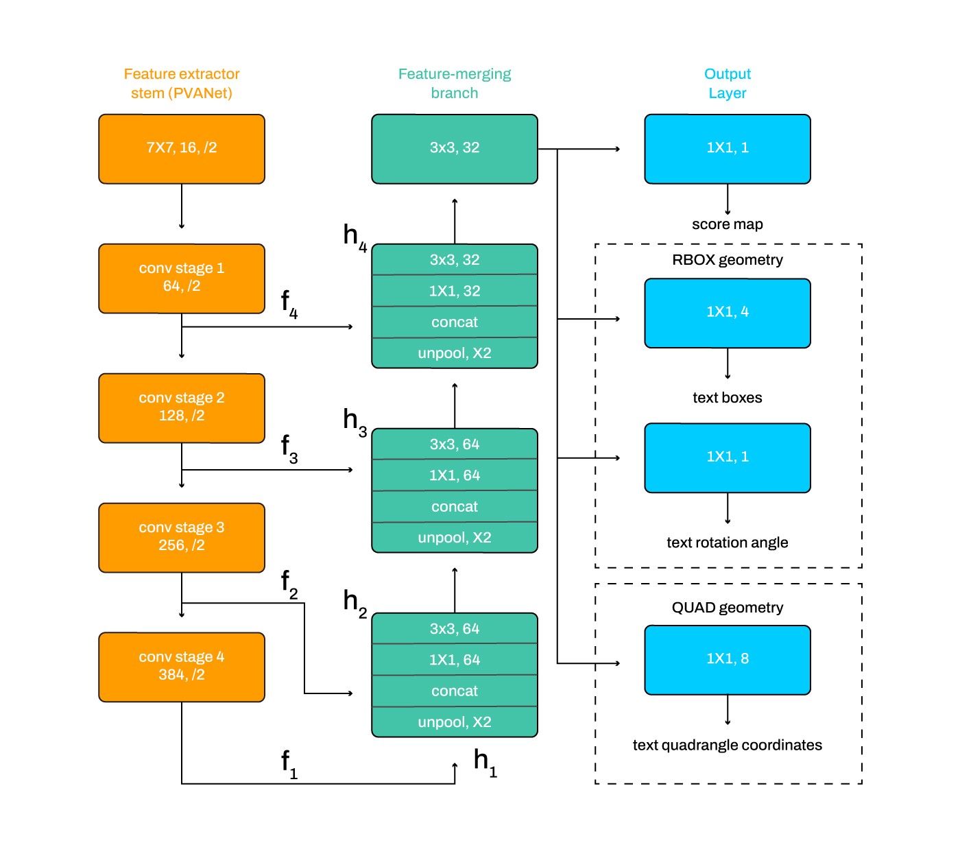 While designing the OCR system, we had both computational complexity and correctness in mind, as the system needs to scale up to the heavy usage and use-cases. We tried models, like Single Shot Detection[4] and R2CNN[5], but keeping in mind the tradeoff between computation and correctness, we settled for the EAST [1] model. The modular architecture of the EAST network is shown in Fig 7.