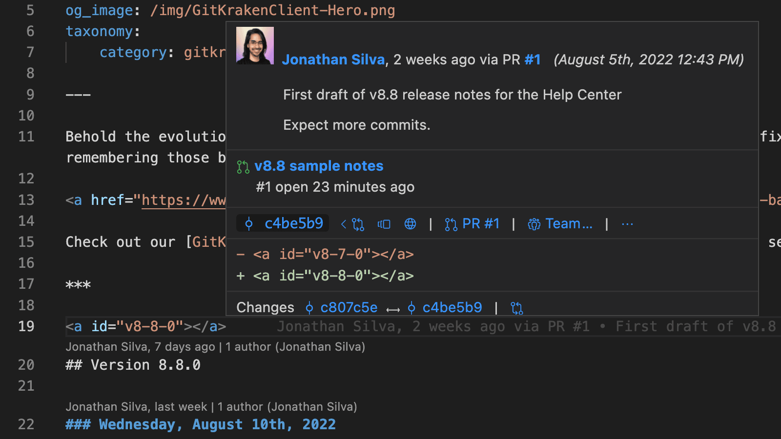 At the end of every line of code, GitLens exposes the author of the last commit, how long ago the commit was made, and other detailed blame information. The status bar blame shows similar information. Hovering over these annotations reveals details about the commit history for each line.