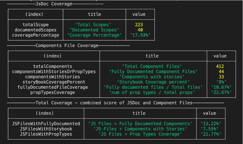 ‘doc-coverage’ is a one of a kind documentation coverage tool for Javascript based projects. It considers Documentation Comments, Stories and Prop Types for calculating the score. As of now it supports 3 frameworks — React, Vue and Svelte. It requires node version 14 or above.
