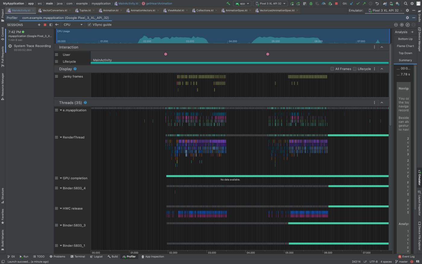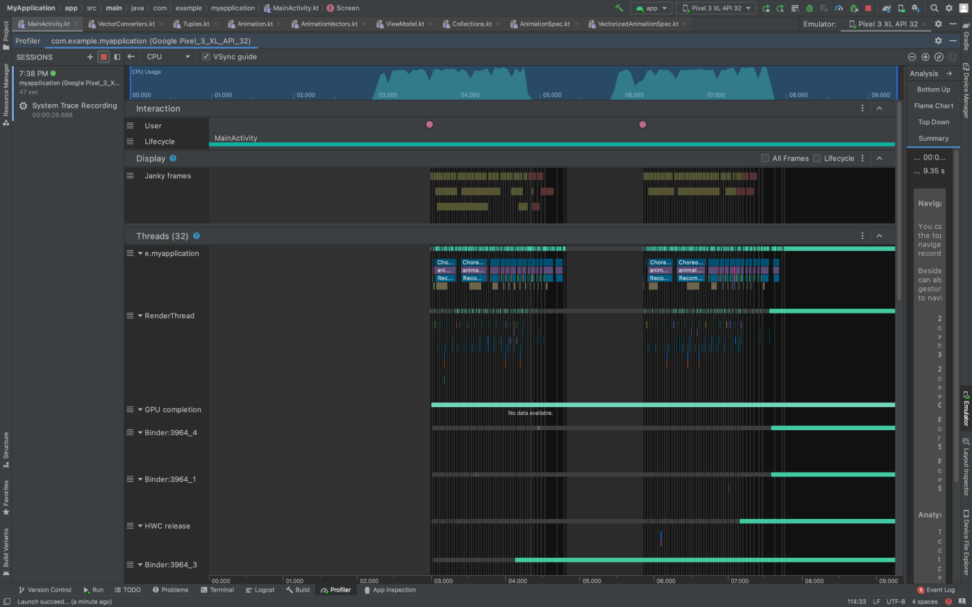 Clearly, option 2 is a more scalable approach, as animating ‘n’ number of objects will be very costly for the CPU as the number of objects increases and each object will require to be recomposed at a separate time as the animationSpec of that object will tick, thus increasing in a greater number of recompositions. This is evident from the above profiler report, the CPU utilization is higher for option 1, thus leading to more jank frames (marked with red denoting the deadline was missed for that frame). GPU performance should be more or less the same because it will have to draw the same number of objects in both cases.
